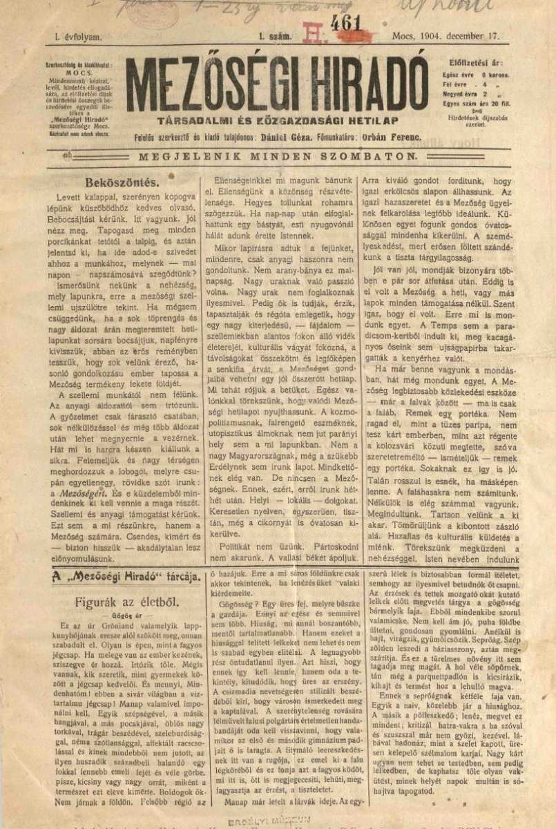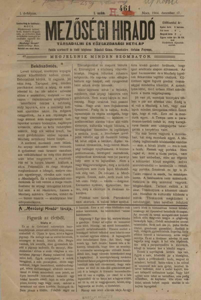 Szellemi támogatást kértünk, kiktől telik az ilyesmi. Ebből nem kaptunk semmit és ha fakó, színtelen volt a mi kis heti lapunk, ezért ne érjen egész nagyságában minket a vád, hanem vegye ki abból férfias becsületességgel, komoly beismeréssel saját részét az az osztály is, mely istenadta tehetségéből parányit sem szánt nem nekünk, hanem a kulturális dolgokban hátul kullogó, fakó Mezőségnek. Valahogyan csak el voltunk szellemi alamizsna, mezőségi lelki morzsa nélkül is. [...] Egyenes, szókimondó nyíltsággal még anyagi támogatás esetén is vajmi nehéz volna fennmaradásunk. Heterogének vagyunk. Származási, faji, kulturális, vallási és más szempontok tagolják fel a Mezőséget. Az oly tekervényes ösvényen csaknem kikerülhetetlen volna a súrlódás. Hadd jöjjön hát vissza a letűnt múlt, az igazi mezőségi élet. Ne zavarjuk senkinek a kalkulusait. Itt az ilyesmit lábatlankodásnak mondják." 46. szám, 1905. december 2., 1–2.