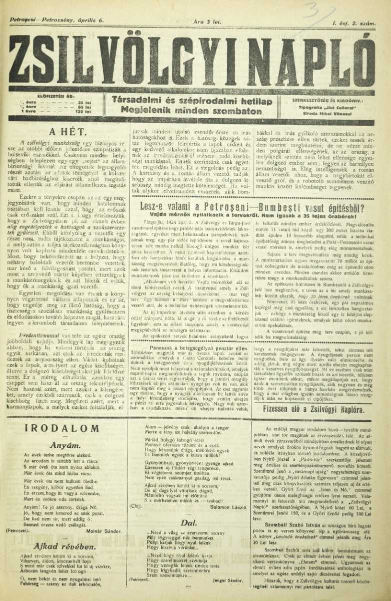Ezt követte a Zsil-völgye leghosszabb életű lapja, a Zsilvölgyi Napló (alcíme szerint társadalmi és szépirodalmi hetilap). 1924 márciusában indult, első szerkesztőként Evien Eugen neve szerepel rajta (ő a szerkesztője az 1925–26-ban ugyancsak Petrozsényben kiadott Bicsérdyzmus c. lapnak is), majd 1929 májusától Molnár Sándor szerkeszti egészen a megszűnésig, 1942. szept. 30-ig (1938-tól, a helységnevek magyar írásmódját betiltó rendelkezések után Napló címmel). Munkatársainak köre természetszerűen befogja a vidék íróit, tollforgatóit (Fáskerti Tibor, Fekete Tivadar, Franyó Zoltán, Lévai Lajos, Ormos Iván, Serestély Béla, Szombati-Szabó István, Tarnóczi Lajos), de találkozunk benne távolabbról jöttekkel (Holló Ernő, Számadó Ernő, Walter Gyula) s az akkor már Erdély-szerte ismertekkel: Áprily Lajos, Bartalis János, Krenner Miklós, Molter Károly, Reményik Sándor, Tompa László is. 1931/46. számában a szerkesztő A romániai magyar kisebbségi hetilapok és szerkesztőinek [!] arcképcsarnoka címmel nagyobb összeállítást közöl. [...]